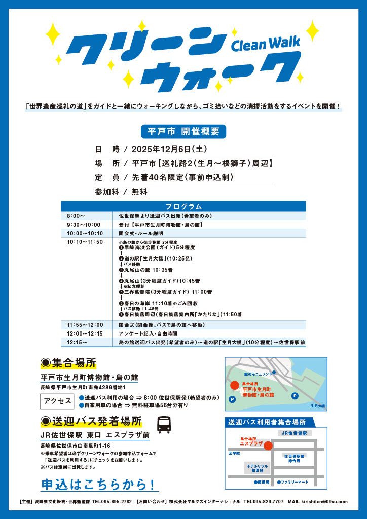12月6日(土)、世界遺産巡礼の道などをガイドと一緒にウォーキングしながら清掃活動を行うイベントを平戸で開催します。(参加無料、先着40名限定)