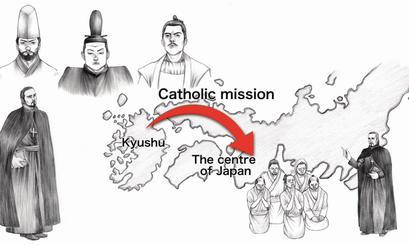 15세기 중엽에 시작된 포르투갈의 세계 진출은 15세기 말에 이르자 아시아에 도달했다. 포르투갈 국왕의 요청으로 예수회 선교사들의 선교활동도 활발해졌는데 이러한 활동은 인도를 거점으로 이루어졌다. 1549년, 예수회 선교사 프란치스코 하비에르 신부는 중국 선박을 통해 일본 가고시마에 상륙하여 일본에 그리스도교를 전파했다. 그 후 하비에르의 뒤를 이어 선교사들이 차례차례 일본으로 건너와 그리스도교를 널리 알렸다.