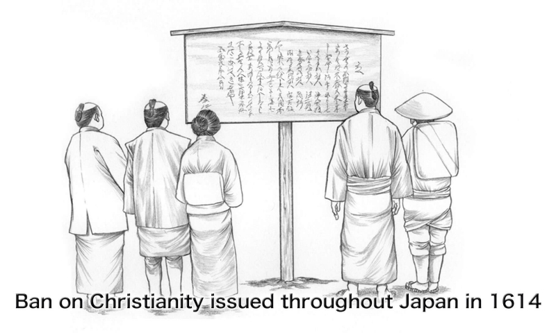 1614년, 에도막부는 정권의 완전 장악을 건 오사카 도요토미 가문과의 전투에 앞서, 막부 내부의 권력투쟁을 배제하고 도쿠가와 가문 중심의 봉건체제를 확립하기 위해 전국에 그리스도교 금교령을 내렸다. 선교사는 마카오나 마닐라로 추방되었고 성당은 파괴되었다. 일본 국내 기리시탄 중 다이묘들은 모두 그리스도교 신앙을 버리고 다시 불교로 개종하였고, 휘하의 무사들도 기리시탄임이 막부에 밀고당하는 것을 우려해 차례로 배교하였다. 그러나 선교사 중에는 일본 국내에 잠복하는 자를 비롯해 추방된 후 재차 일본으로 잠입하여 은밀히 기리시탄을 지도하는 자들이 끊이지 않았다.