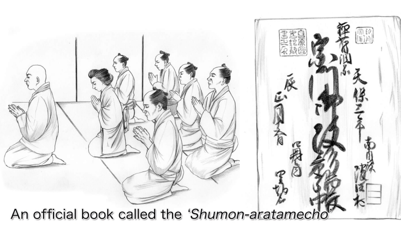 금교 정책 아래 각지에서 몰래 신앙을 이어가던 자들(잠복 기리시탄)을 색출하려는 움직임은 한층 더 강화되어 에도막부는 성화상이나 메달 등의 신앙 도구를 밟게 하는 ‘에후미(絵踏)’를 시행하고 ‘고닌구미(五人組)’ 제도를 도입하여 밀고 대상을 일반 백성으로까지 확대해 잠복 기리시탄을 적발하고자 했다. 또한 모든 백성들에게 불교로 귀의할 것을 강요하고 사원의 단가로서 ‘슈몬 아라타메초(宗門改帳)’에 종파 및 소속 사원을 기재한 뒤 그들을 사원의 관리 하에 두었다. 그 결과 1617년에서 1644년 사이에 75명의 선교사와 1,000명이 넘는 잠복 기리시탄들이 체포되어 처형되었다.