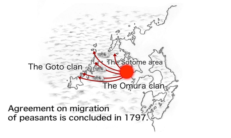 18세기 말이 되자 잠복 기리시탄 취락이 있던 니시소노기 반도 서쪽 해안에 위치한 오무라 번의 소토메 지역에서는 경사면이라는 지형 조건의 제약으로 농작물 수확이 많지 않았음에도 종교상의 이유로 산아제한을 하지 않았고, 이에 따른 인구 증가가 심각한 사회 문제로 이어졌다. 이러한 상황에서 1797년, 인구가 적어 경작민이 필요했던 고토 번이 건너편의 오무라 번과 협정을 맺고 소토메 지역에서 개척 이주민을 모집하는 정책을 개시했다. 이로써 소토메 지역에서 많은 주민들이 고토 열도로 이주하게 되었는데, 이 중에는 잠복 기리시탄들도 다수 포함되어 있었다. 그들은 상황에 따라 이주를 거듭하며 고토 열도 등 여러 섬에 잠복 기리시탄 취락을 형성해 갔다.